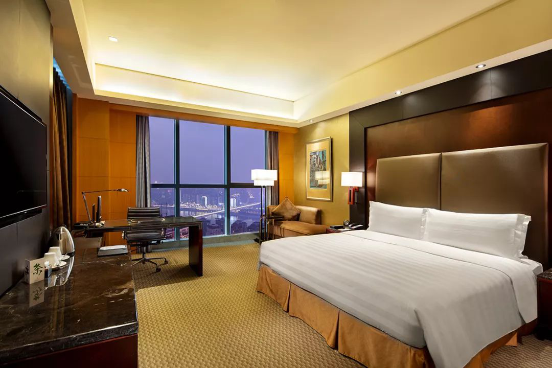 拥有各类豪华宽敞、时尚温馨的客房,均配有超大落地玻璃窗,可鸟瞰市中心繁华和两江璀璨夜景。